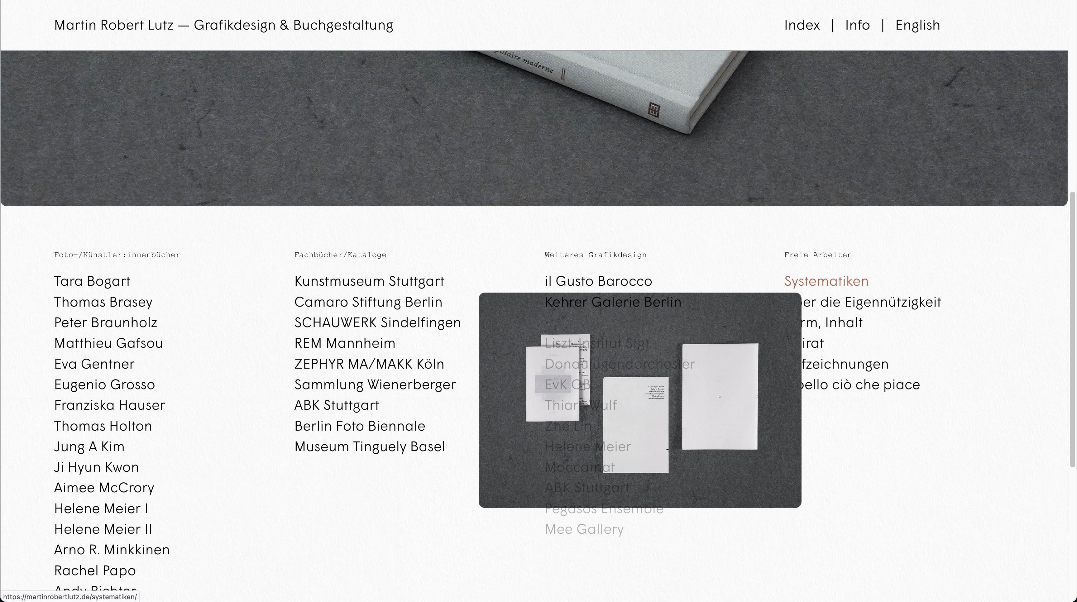 When you scroll down to a position where the hovering images of the links in the index flip above the cursor, they lie on top of the carousel – as they should, since the carousel is placed on the bottom in the "layers" tool of the editor:
