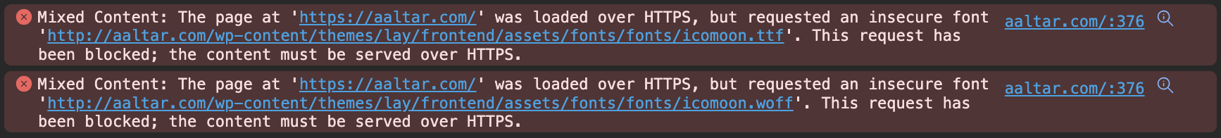 The browser console mentions that the icon couldn't be loaded since it needs to be served over HTTPS (image in attachment).